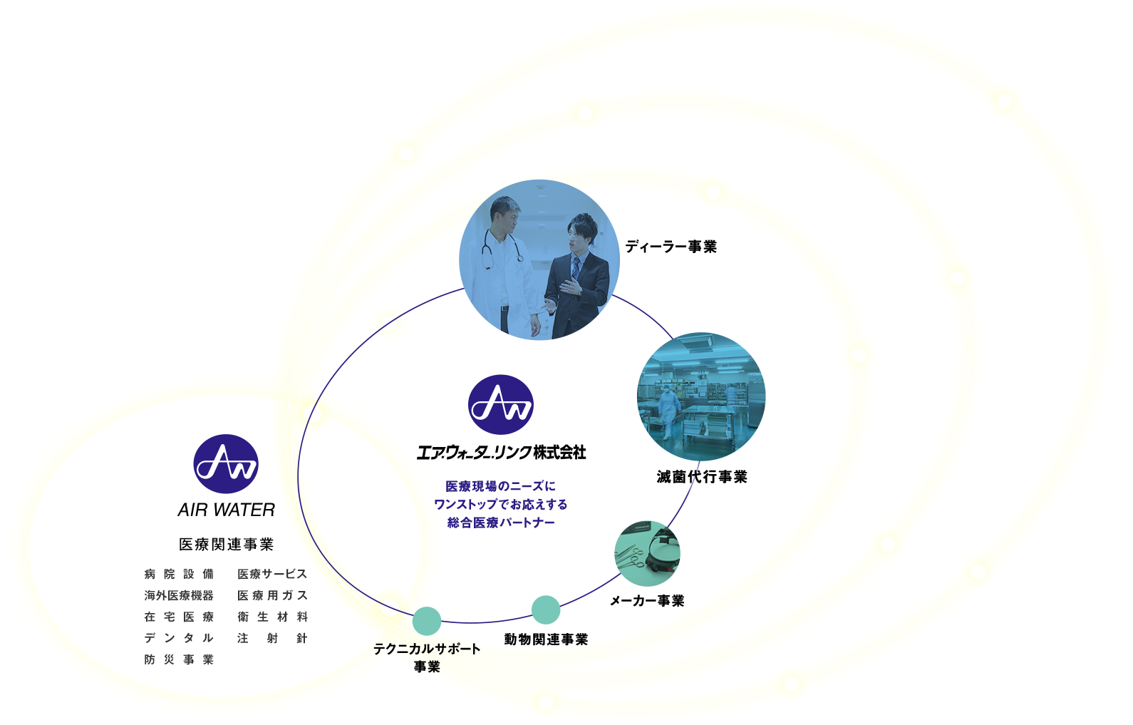 エア・ウォーター・リンクは、祖業の産業ガス関連をはじめ多彩な事業を展開するエア・ウォーター株式会社のグループ会社です。そのグループ会社の中で、私たちは医療機器メーカーと、お客さまである病院等の医療現場をつなぐ商社としての役割を担っています。